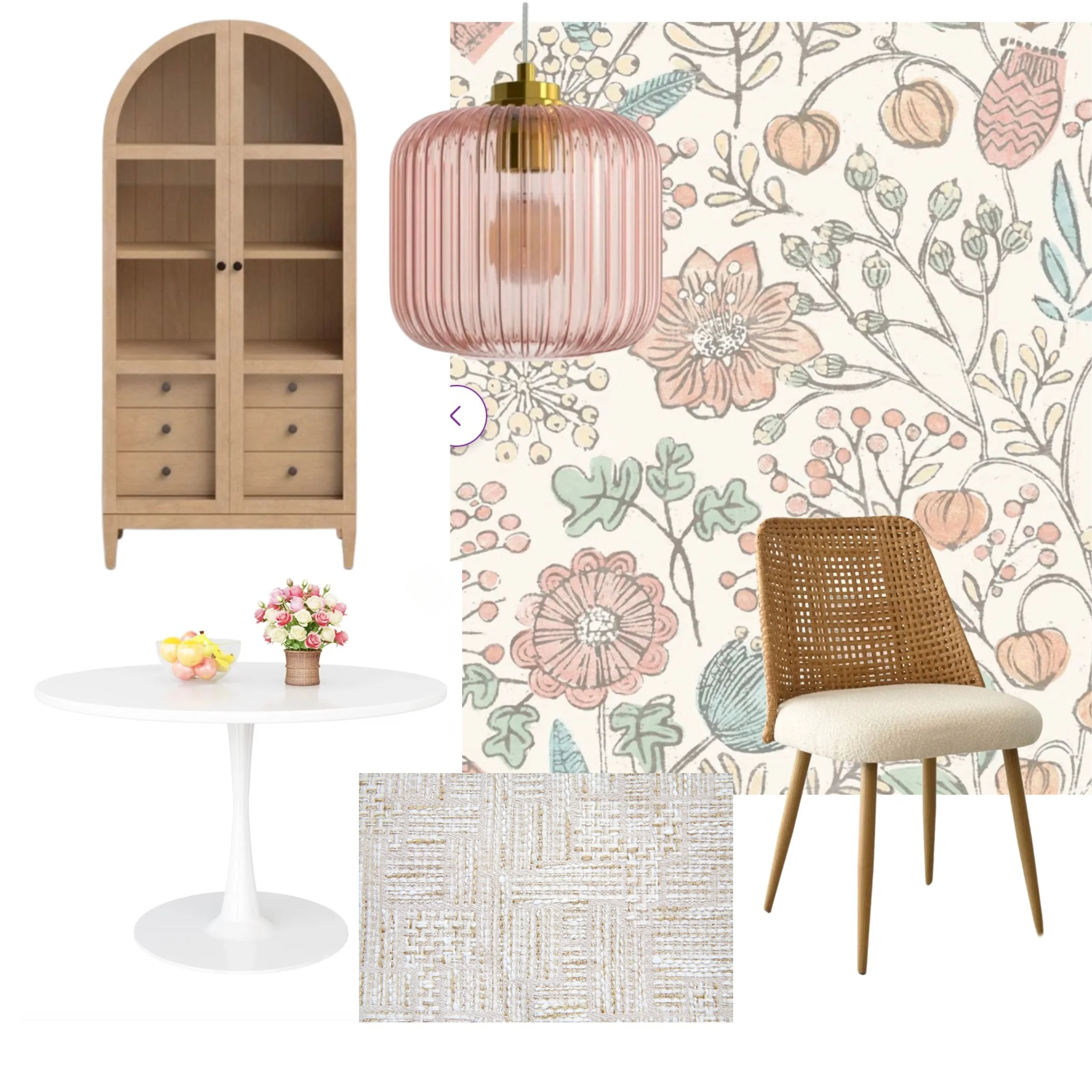 Mood boards are used ALOT in Interior Design. Something as simple as sitting down and scrolling Pinterest and building one out can really help with your overall vision and seeing all your design choices come together! In this one here, the light fixture fits perfectly with the overall color choices!